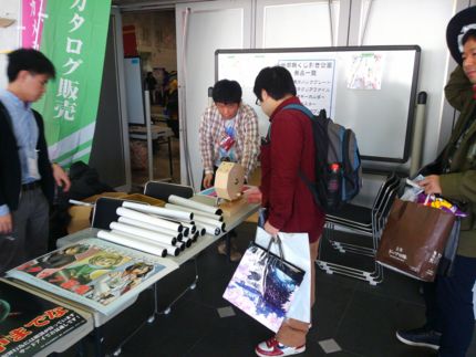 サークルから何かを購入するごとにガラポンチケットを1枚プレゼント。5枚で空くじなしのガラポンを回せます。 ポスター、キーホルダー、ステッカーなどが貰えます。よく見るとスタッフ募集と書かれたポスターが左下にありますが、まさか、ね。