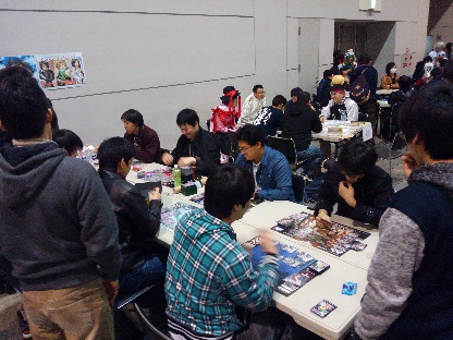 カードゲームブース。熟練の(?)スタッフが初心者のルール解説からガチバトルまで優しく歓迎してくれます。 VISION以外のカードゲームでの野良デュエルも盛んでした。